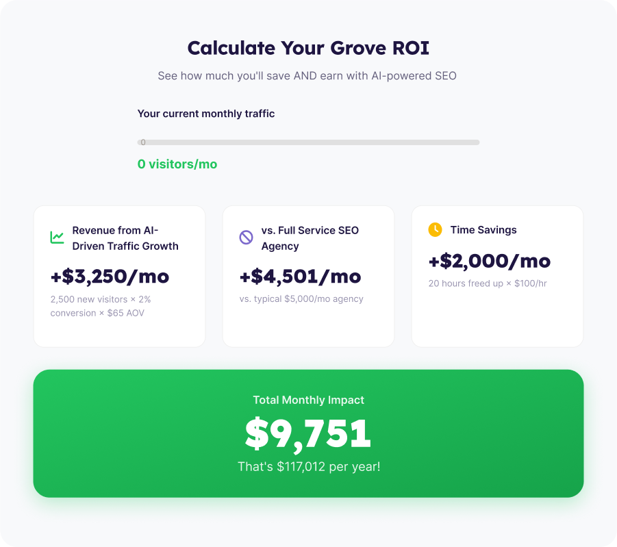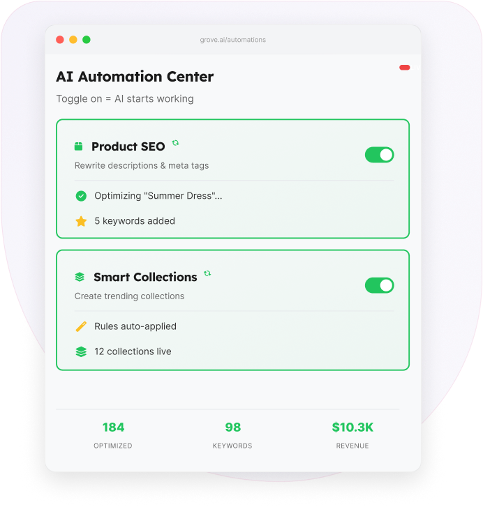 Stop paying agencies that deliver Excel sheets instead of results. Grove optimizes your entire Shopify catalog 24/7, creating content that ranks and converts.