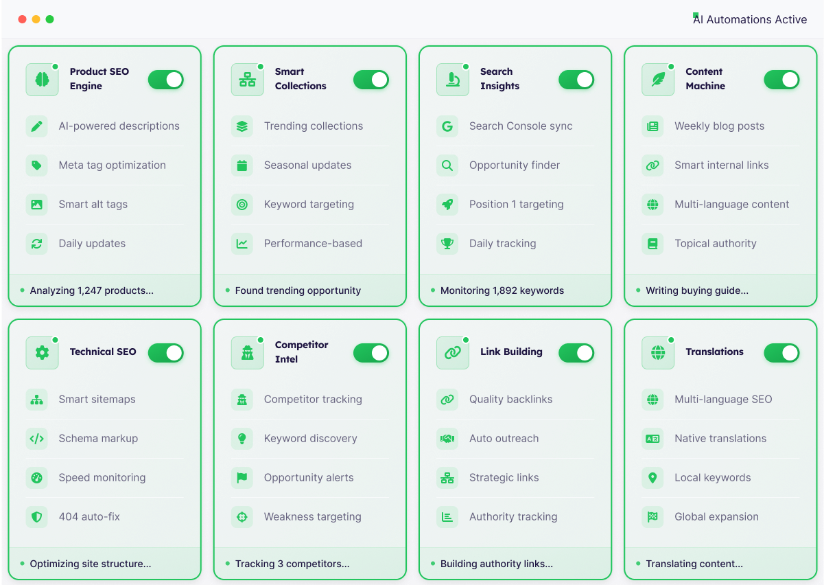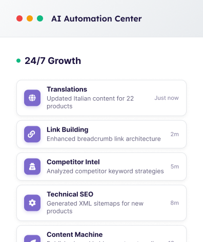Agencies lock you into long contracts. We optimize your entire catalog in hours, not months. See traffic improvements in days, not quarters.